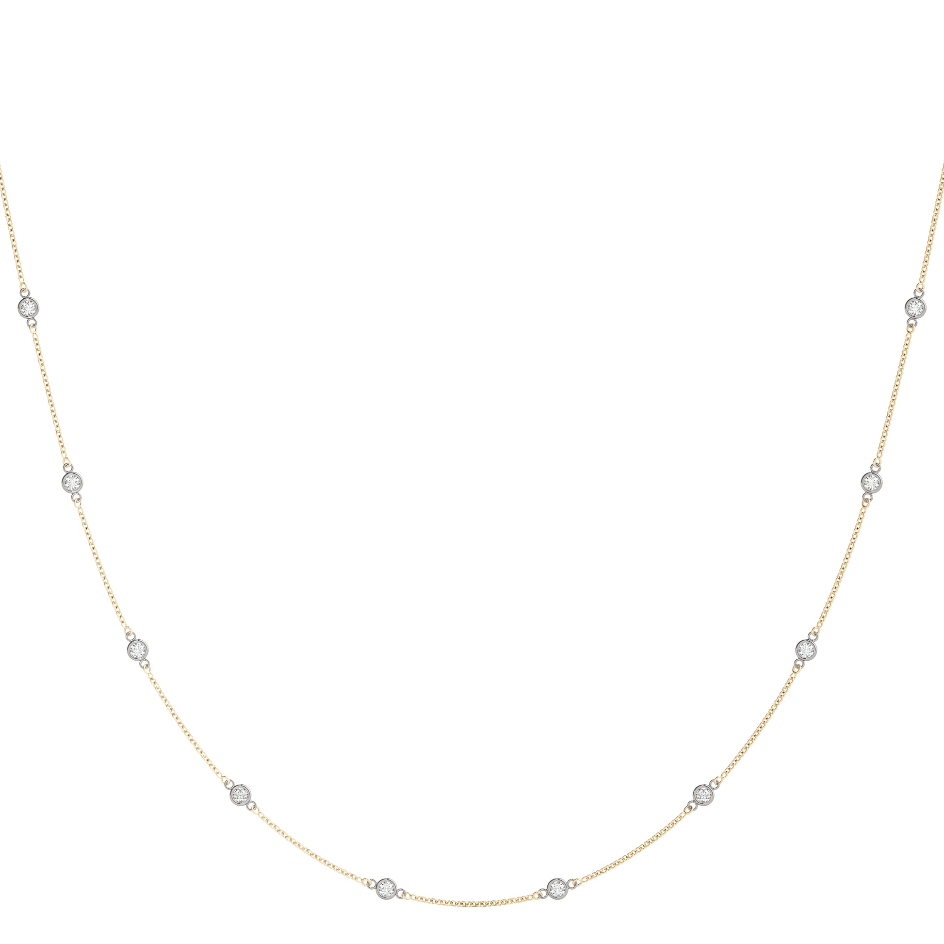 This diamond station necklace from Encore DT exudes timeless elegance, featuring 1.00CT total weight of round-cut bezel-set diamonds beautifully spaced along a delicate 14K White Gold chain. Designed with a floating diamond effect, this modern yet classic piece adds effortless sophistication to any look. The secure bezel settings enhance durability while allowing each diamond to shine brilliantly. With its refined and versatile design, this necklace is perfect for layering or wearing alone as a statement of understated luxury. Available now at Encore DT in White, Rose, or Yellow Gold!