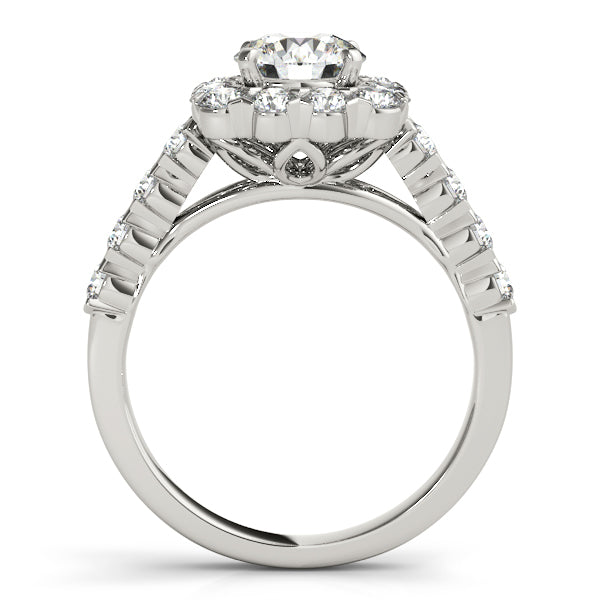 This breathtaking round-cut diamond engagement ring from Encore DT features a brilliant halo of sparkling diamonds that amplifies the center stone’s radiance. The 14K White Gold band showcases graduated side stones that taper gently, adding dimension and luxury, while remaining comfortable and elegant. Beneath the center stone, a delicate three-leaf floral motif adds a romantic and whimsical touch, showcasing the ring’s intricate craftsmanship. The secure prong setting ensures durability and maximizes light reflection for exceptional brilliance. Comes set with a Lab Diamond (VS1/F/Excellent Cut) by default, with other stone options and Setting Only available. Perfect for proposals, this timeless halo design blends vintage-inspired charm with modern sophistication. Shop now at Encore DT and let this exquisite ring symbolize your forever!