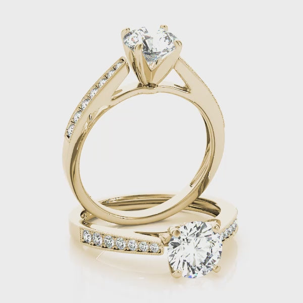 This elegant engagement ring features a 1CT Lab Grown Diamond (VS1 clarity, F color, Excellent cut) in a secure four-prong setting, framed by 14 natural diamond side stones along a tapered channel-set band. Crafted in 14K Yellow Gold with a cathedral silhouette, the arch lifts the center stone while maintaining a refined, airy profile. Milgrain accents along the band edges add vintage character to the contemporary design. Also available as a Setting Only or in two-tone yellow and white gold, this piece offers timeless sophistication with a personalized touch.
