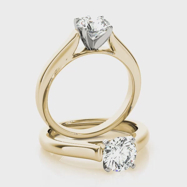 This timeless solitaire engagement ring glows in 14K Yellow Gold, featuring a 1CT Lab Grown Diamond (VS1 clarity, F color, Excellent cut) held securely in a classic four-prong setting. The sleek, unadorned band tapers gently toward the center stone, offering a clean silhouette that highlights its brilliance. Also available as a Setting Only or in a two-tone yellow and white gold combination, this design blends simplicity and sophistication for those who appreciate timeless style.