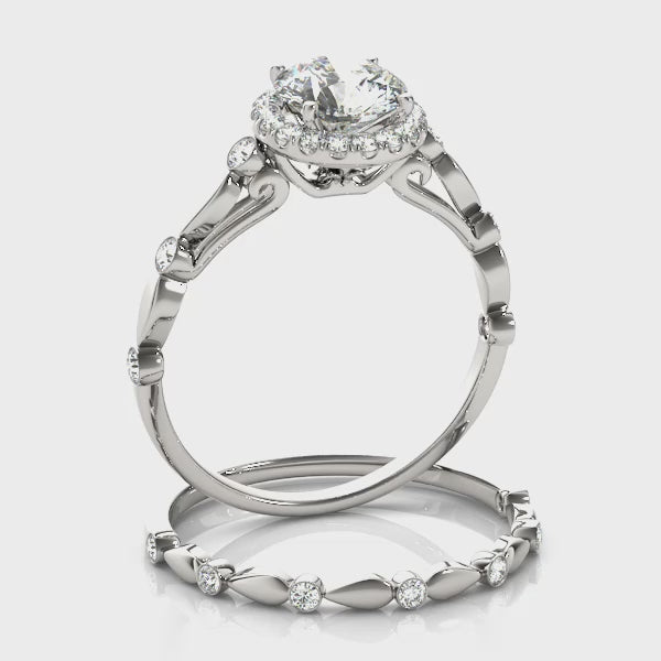 The ring showcases a stunning round-cut center stone, preset with a 1CT Lab Diamond (VS1/F/Excellent Cut), surrounded by a delicate halo of natural side diamonds for exceptional sparkle. Crafted in 14K White Gold, the tapered band features alternating marquise-shaped and round natural diamonds, adding a floral-inspired elegance to the design. Intricate scrollwork beneath the halo enhances the vintage allure while offering structural beauty. Also available as a Setting Only, this ring can be customized in White, Rose, or Yellow Gold and pairs beautifully with a matching wedding band, available exclusively at Encore DT.