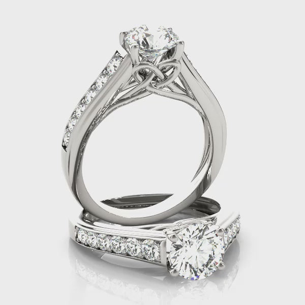 Blending classic charm with modern grace, this engagement ring from Encore DT features a brilliant round-cut 1CT Lab Grown Diamond (VS1/F/Excellent Cut) as the centerpiece. Designed in 14K White Gold, the band tapers elegantly, wider at the top to showcase 12 natural side diamonds, then narrowing toward the base for a balanced and refined silhouette. A unique intertwining design in the under-gallery forms a subtle infinity motif, symbolizing everlasting love. This ring is preset with a 1CT Lab Diamond but can also be ordered as a Setting Only or customized with alternative center stones. Available in White, Rose, or Yellow Gold — a meaningful and beautifully detailed creation from Encore DT.
