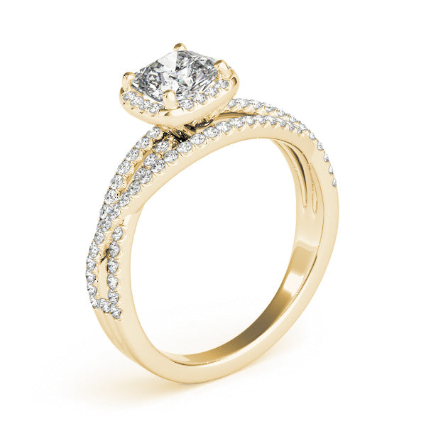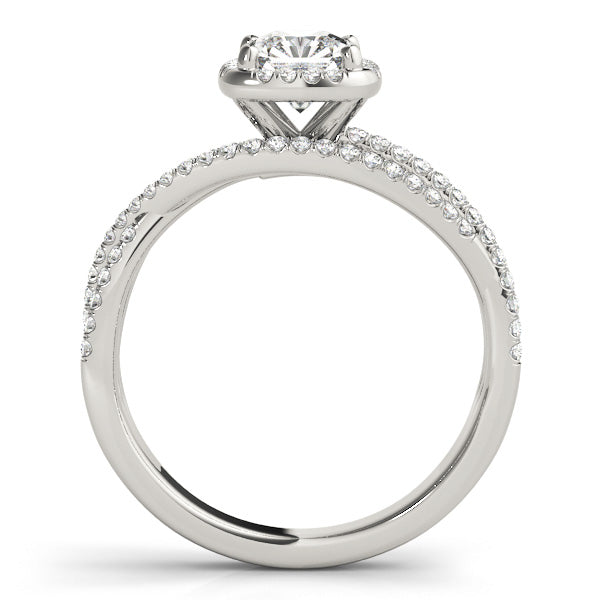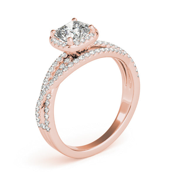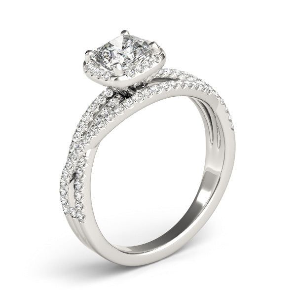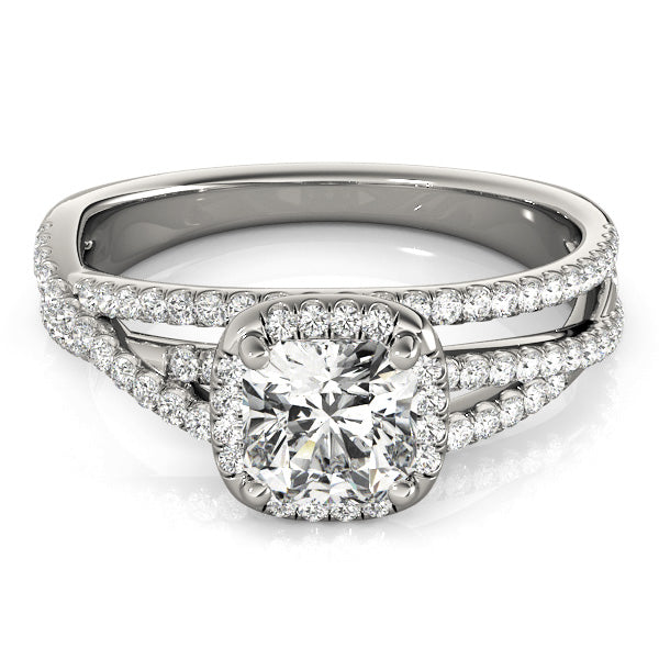 Sophisticated and radiant, this breathtaking split-shank engagement ring from Encore DT features a brilliant cushion-cut 1CT Lab Grown Diamond (VS1/F/Excellent Cut) framed by a luminous halo of natural round diamonds that amplify its fire. Crafted from polished 14K White Gold, the split-shank band curves elegantly, intersecting and sparkling with 58 additional side diamonds for a captivating, luxurious effect. The band tapers gracefully toward the base, balancing intricate detailing with a sleek, modern silhouette. Preset with a 1CT Lab Diamond but also available as a Setting Only or customizable with alternative center stones, this design can be crafted in White, Rose, or Yellow Gold — experience timeless elegance with Encore DT.
