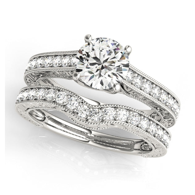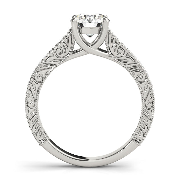 A celebration of elegance, this breathtaking engagement ring features a classic round-cut 1CT Lab Grown Diamond (VS1/F/Excellent Cut) secured in a timeless four-prong setting. Crafted in luxurious 14K White Gold, the band glitters with 16 natural side diamonds that enhance the brilliance of the centerpiece. Intricate milgrain detailing and vintage-inspired scrollwork along the profile lend a refined, artistic charm, while the slightly tapered design widens near the top to beautifully frame the diamonds. This design comes preset with a 1CT Lab Diamond but can also be customized with other center stones or ordered as a Setting Only. Available in White, Rose, or Yellow Gold — a sophisticated statement of love, exclusively from Encore DT.