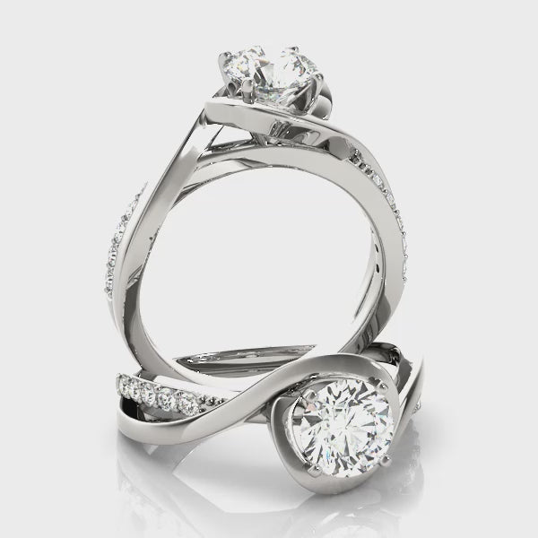 This elegant engagement ring features a 1CT round-cut Lab Grown Diamond (VS1 clarity, F color, Excellent cut) set in a secure four-prong head. Crafted from solid 14K white gold, the split shank bypass design wraps gently around the center stone, forming a graceful, intertwined silhouette. Ten natural accent diamonds line the curved band, adding sparkle and refinement from every angle. The band tapers for comfort and pairs beautifully with a matching wedding band. Available in white, yellow, or rose gold, this ring can be purchased with the preset 1CT center or as a setting only. Designed with signature Encore DT craftsmanship and backed by our 30-day return guarantee.