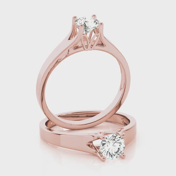 This stunning solitaire engagement ring showcases a 1CT Lab Grown Diamond (VS1/F/Excellent Cut) in a distinctive open cathedral setting that maximizes light from every angle. The 14K Rose Gold band tapers subtly for a modern yet comfortable fit. Petal-inspired details along the gallery bring a soft romantic touch to the sleek design. This customizable piece is also available as a Setting Only or with alternative center stones.
