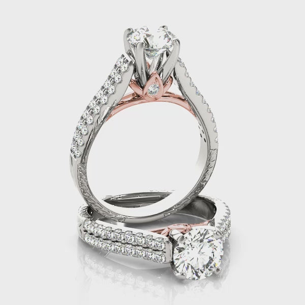 Romantic beauty meets refined craftsmanship in this breathtaking engagement ring from Encore DT, featuring a brilliant round-cut 1CT Lab Grown Diamond (VS1/F/Excellent Cut) elevated in a secure four-prong setting. The 14K White Gold split-shank band dazzles with 38 pavé-set natural side diamonds, offering unmatched sparkle from every angle. A delicate touch of 14K Rose Gold beneath the center stone forms a romantic, flower-like accent, while intricate engravings add to its artistry. Preset with a 1CT Lab Diamond but customizable with other center stones or available as a Setting Only, this piece perfectly blends modern elegance with timeless charm — exclusively at Encore DT.