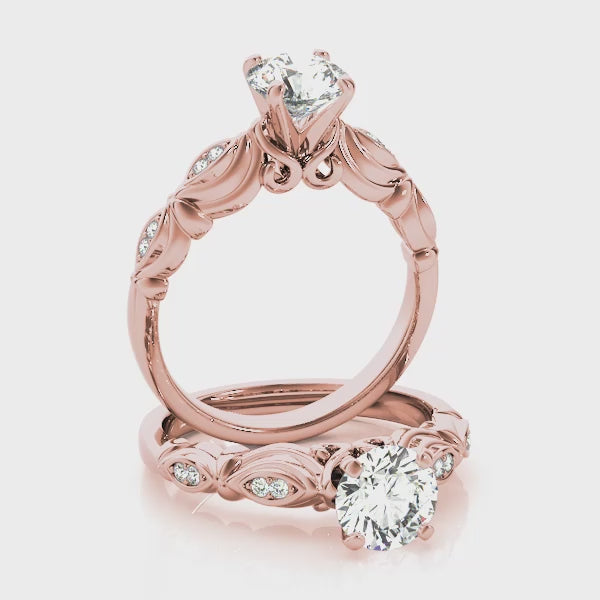 Nature-inspired beauty defines this solitaire engagement ring, showcasing a 1CT Lab Grown Diamond (VS1 clarity, F color, Excellent cut) embraced by petal-like accents and clusters of natural marquise-shaped side diamonds. Crafted in 14K Rose Gold, the tapered band narrows at the base and widens near the center for both comfort and elegance. A polished finish enhances the organic curves and intricate detail. This design is also available as a Setting Only or with other center stone options. Pair with a matching band to complete your bridal vision.