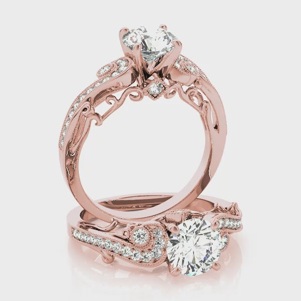 This romantic engagement ring blends vintage charm and modern brilliance with a 1CT Lab Grown Diamond (VS1/F/Excellent) set in a classic four-prong cathedral mount. The 14K Rose Gold band is adorned with 30 natural side diamonds and accented by fine milgrain edging. Swirling patterns and hidden filigree details beneath the stone add richness and depth to the design. Offered with additional center stone options or as a Setting Only. Pair it with the coordinating wedding band for a truly refined bridal set.