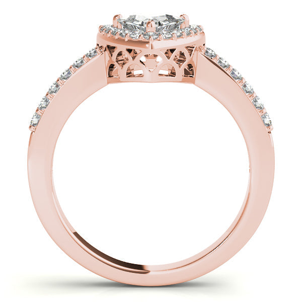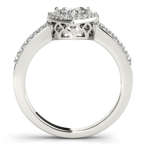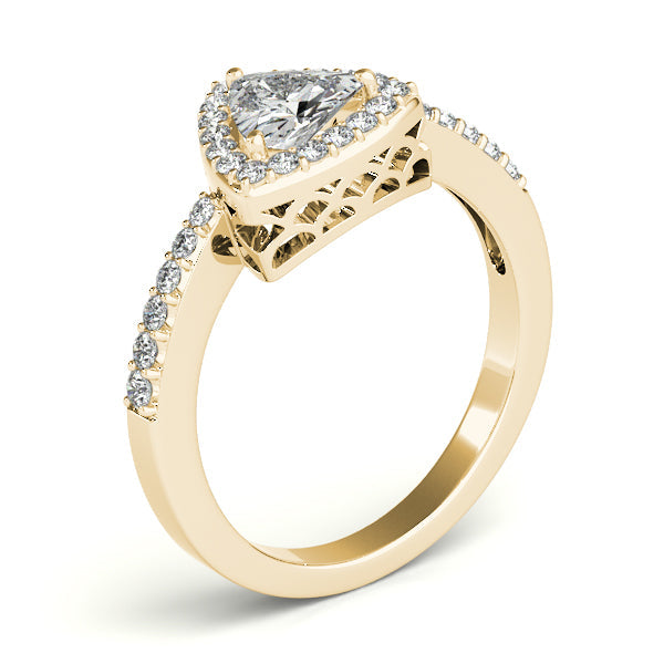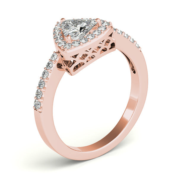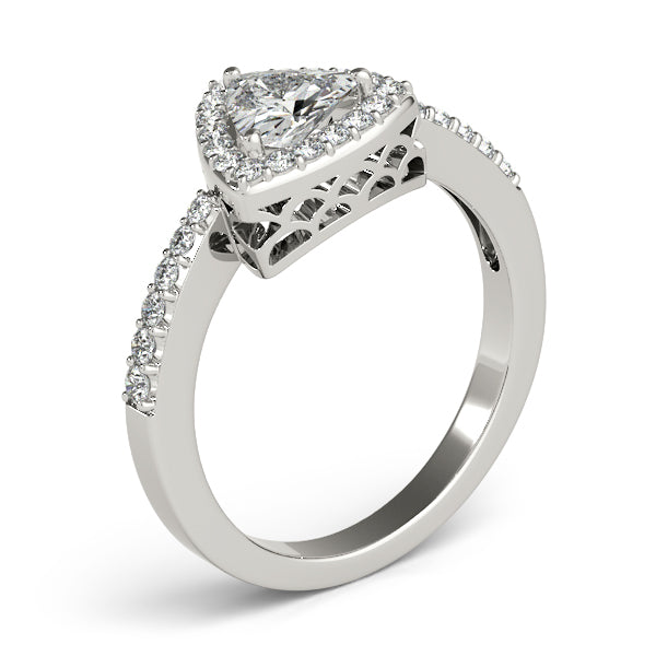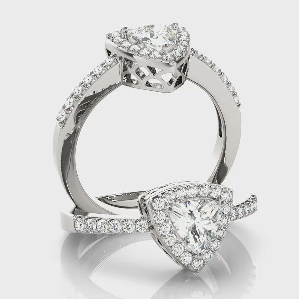 This dazzling ring showcases a unique trillion-cut center stone surrounded by a delicate halo of round diamonds, creating a stunning geometric silhouette. The halo features a shimmering frame of diamonds that accentuate the triangular shape, offering a bold and contemporary flair. The band, set with pave diamonds along the shoulders, elegantly tapers toward the base, ensuring a comfortable and lightweight fit while maintaining its brilliance. A striking gallery with intricate latticework adds a touch of sophistication and makes the setting a visual masterpiece from every angle. Crafted in 14K White Gold, and also available in Rose or Yellow Gold, this versatile design comes with a 1CT Lab Diamond (VS1/F/Excellent Cut) or can be purchased as a Setting Only—perfect for making your dream ring uniquely yours.