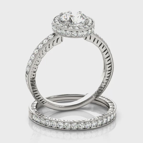 This enchanting masterpiece combines vintage allure with modern elegance, preset with a 1CT Lab Diamond (VS1/F/Excellent Cut) and encircled by a halo of natural side diamonds. Delicate milgrain detailing frames the halo, evoking the beauty of antique treasures, while 55 shimmering natural diamonds enhance the band’s textured, etched finish. The elegant under-gallery features additional diamond accents along the bridge, creating a refined layered effect that elevates the overall design. Crafted in 14K White Gold, with Rose and Yellow Gold options available, this extraordinary ring can also be purchased as a setting-only choice. Complete your bridal vision exclusively at Encore DT.