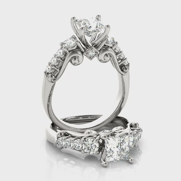 Bold elegance defines this stunning engagement ring from Encore DT, featuring a radiant princess-cut 1CT Lab Grown Diamond (VS1/F/Excellent Cut) securely cradled in a classic four-prong setting. Designed in luminous 14K White Gold, the band showcases 10 round natural side diamonds positioned along a softly curved structure, enhancing the ring’s overall brilliance. Vintage-inspired scrollwork and delicate milgrain detailing beneath the center stone add depth and artistry to the design, while the band maintains a balanced width for comfort and durability. Preset with a 1CT Lab Diamond but also available as a Setting Only or customizable with alternative center stones, this piece can be crafted in White, Rose, or Yellow Gold — a timeless expression of love from Encore DT.