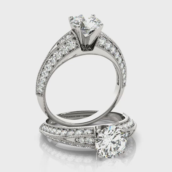 This breathtaking split-shank engagement ring showcases a brilliant round-cut 1CT Lab Grown Diamond (VS1/F/Excellent Cut) set in a classic four-prong arrangement, thoughtfully elevated for maximum light and sparkle. Crafted in luminous 14K White Gold, the split band is adorned with a total of 40 shimmering natural side diamonds, arranged in three elegant rows framed by intricate milgrain detailing for a vintage-inspired touch. Gentle curves along the sides of the band create a flowing, graceful silhouette that enhances its timeless sophistication. This design comes preset with a 1CT Lab Diamond but can also be customized with alternative center stones or ordered as a Setting Only. Complete the look by pairing it with a matching wedding band — a perfect blend of contemporary flair and old-world charm, exclusively from Encore DT.