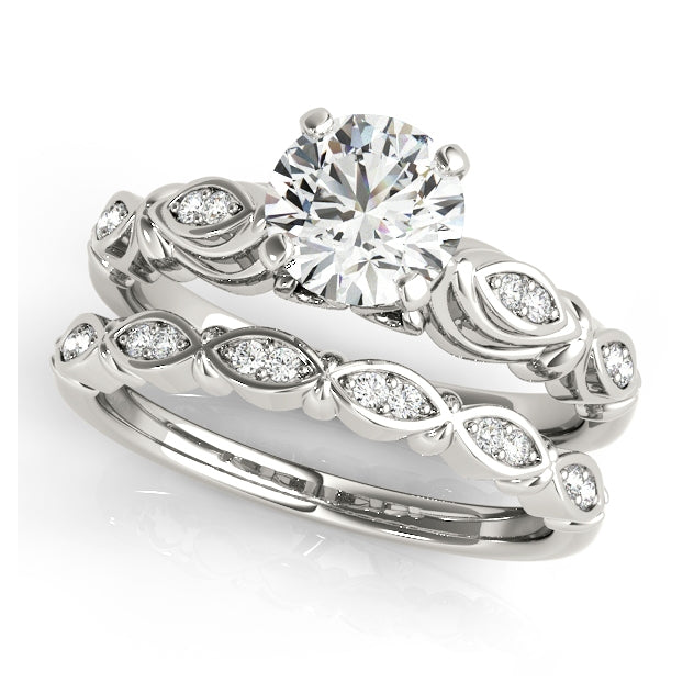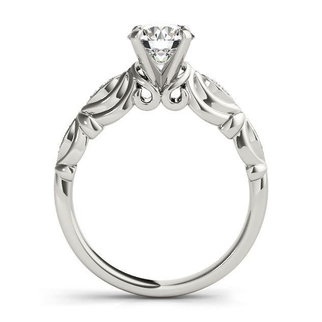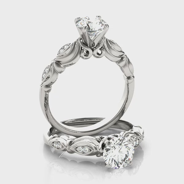 This enchanting solitaire engagement ring features a brilliant round-cut 1CT Lab Grown Diamond (VS1/F/Excellent Cut) set securely within a timeless four-prong design, offering a graceful and nature-inspired beauty. Crafted in 14K White Gold, the band flows artistically with petal-like details accented by marquise-shaped clusters of natural side diamonds, creating a soft, botanical aesthetic. The band tapers gently at the bottom for a comfortable fit, while widening elegantly toward the center to emphasize the stone's brilliance. Finished with a polished surface that highlights the delicate side detailing, this ring comes preset with a 1CT Lab Diamond but is also available as a Setting Only or can be customized with other center stones. Offered in White, Rose, or Yellow Gold — pair it with a matching wedding band for a complete, unforgettable bridal look from Encore DT.