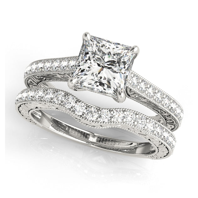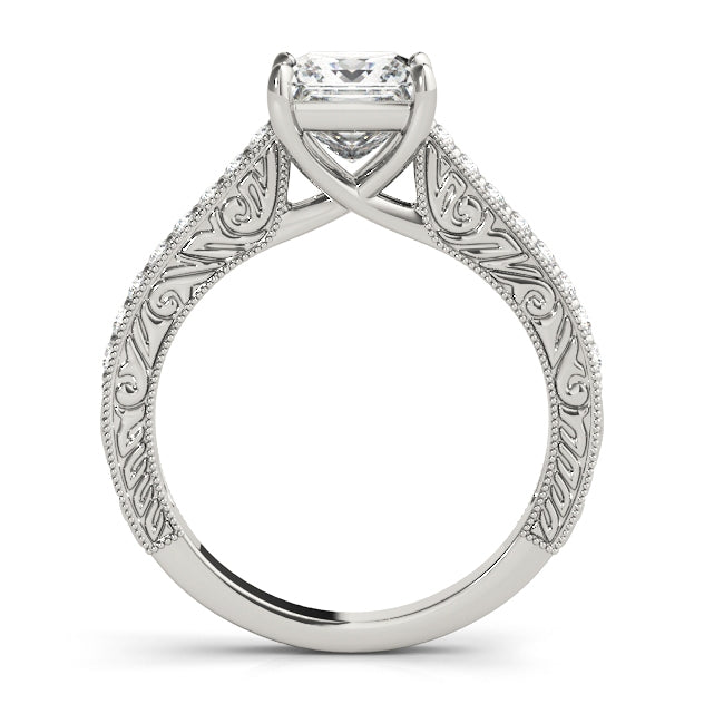 A breathtaking expression of vintage-inspired artistry, this Encore DT engagement ring features a radiant princess-cut 1CT Lab Grown Diamond (VS1/F/Excellent Cut) embraced by a secure four-prong setting that highlights its refined elegance. Shaped from fine 14K White Gold, the band dazzles with 16 natural side diamonds nestled within scrollwork and milgrain embellishments that evoke old-world charm. A graceful crossover trellis shank flows effortlessly into the center setting, while the slightly tapered band ensures a comfortable and elegant fit. This design is preset with a 1CT Lab Diamond but also available as a Setting Only or customizable with alternative center stones. Complete your bridal vision with a matching wedding band, exclusively from Encore DT.