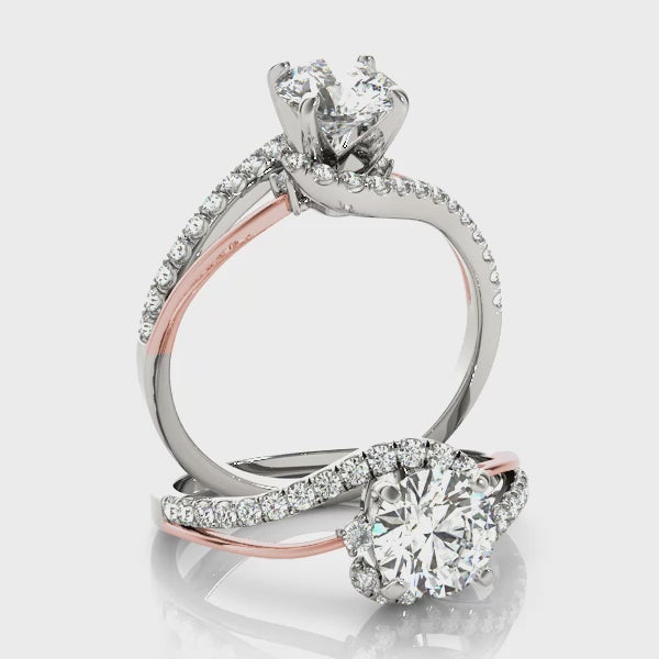 This two-tone bypass engagement ring is a bold yet graceful statement in 14K White and Rose Gold. Designed with a modern curved split-shank bypass setting, the band gently sweeps around the center, creating an open, fluid silhouette that draws the eye. At its center, a 1CT round Lab Grown Diamond (VS1/F/Excellent Cut) captures attention, enhanced by 28 natural round side diamonds that follow the elegant contours of the bypass design. This two-tone engagement ring offers a contemporary twist on classic romance, perfect for those seeking a unique engagement ring with movement and meaning. Also available as a Setting Only or with your choice of center stone. Customize in Rose, Yellow, 18K Gold, or Platinum for a personalized finish. Encore DT—where two-tone bypass engagement rings come to life.