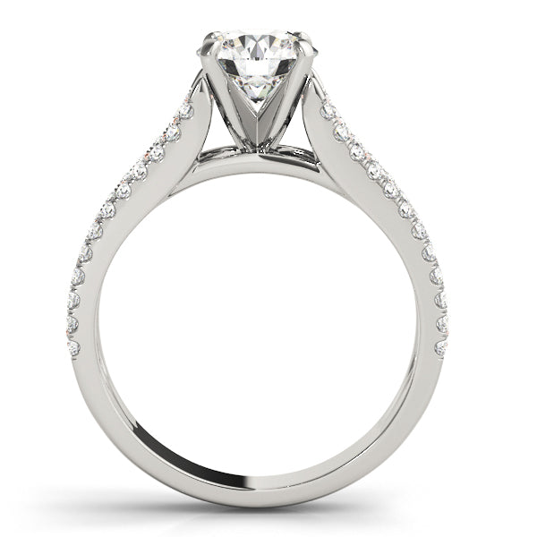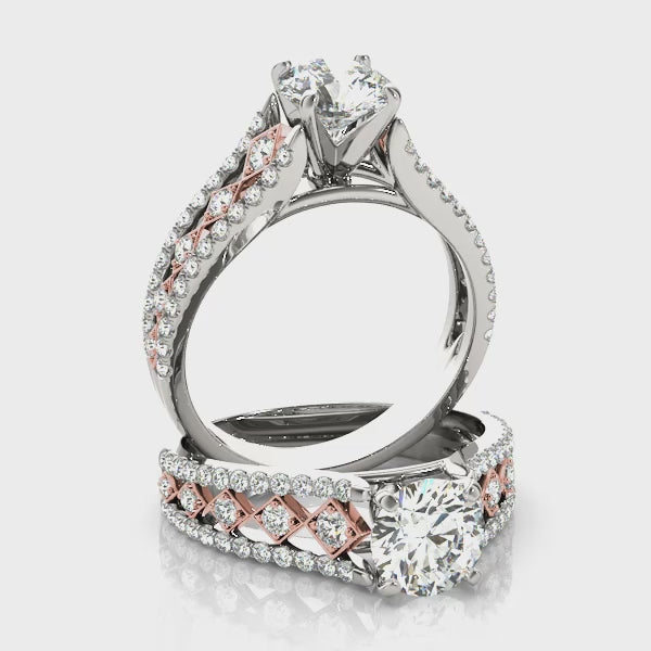 Striking artistry defines this captivating engagement ring from Encore DT, showcasing a round-cut 1CT Lab Grown Diamond (VS1/F/Excellent Cut) elevated in a classic four-prong setting. Crafted from premium 14K White Gold with radiant 14K Rose Gold accents, the distinctive split-shank band is adorned with 58 natural side diamonds, forming a geometric lattice design reminiscent of fine filigree. Delicate rose gold frames each diamond, offering a breathtaking two-tone effect, while the band tapers gently toward the base for a comfortable, elegant fit. Preset with a 1CT Lab Diamond but customizable with other center stones or available as a Setting Only, this exclusive piece is available in White, Rose, or Yellow Gold — a statement of refined elegance, only at Encore DT.