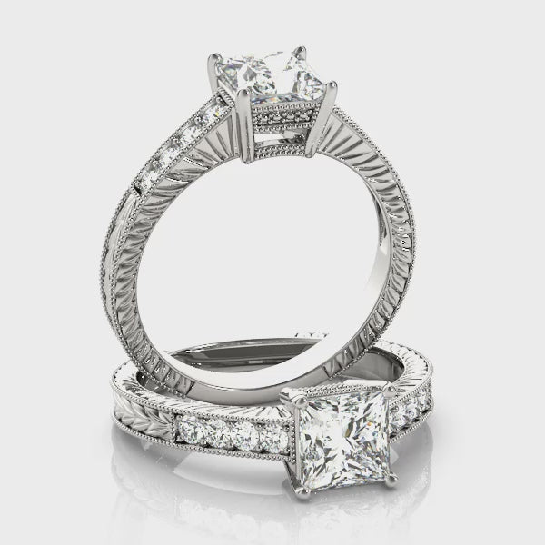 1CT Princess Cut Diamond Vintage Engagement Ring with Filigree & 1/6CT Side Stones
