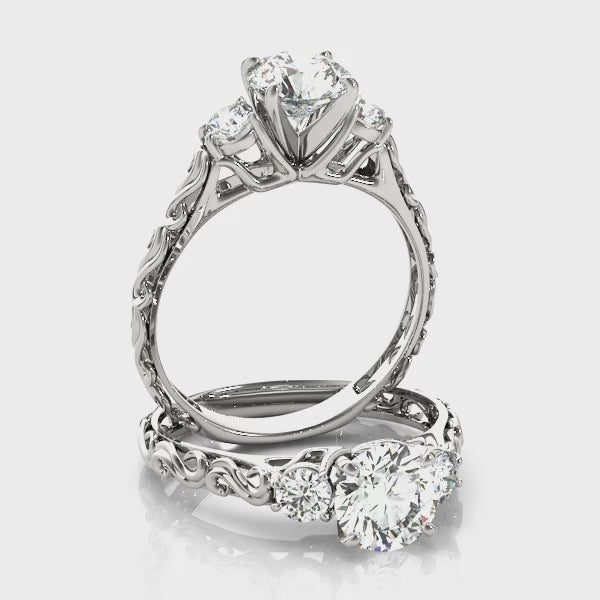 Evoking natural beauty and timeless grace, this captivating three-stone engagement ring from Encore DT features a brilliant round-cut 1CT Lab Grown Diamond (VS1/F/Excellent Cut) complemented by two matching round side diamonds. Crafted in luminous 14K White Gold, the stones are securely held in classic four-prong settings to maximize sparkle and durability. Along the polished band, intricate vine-like detailing adds a unique, organic charm that sets this design apart. This ring comes preset with a 1CT Lab Diamond but can also be customized with alternative center stones or ordered as a Setting Only. Offered in White, Rose, or Yellow Gold — a truly one-of-a-kind creation to symbolize everlasting love.