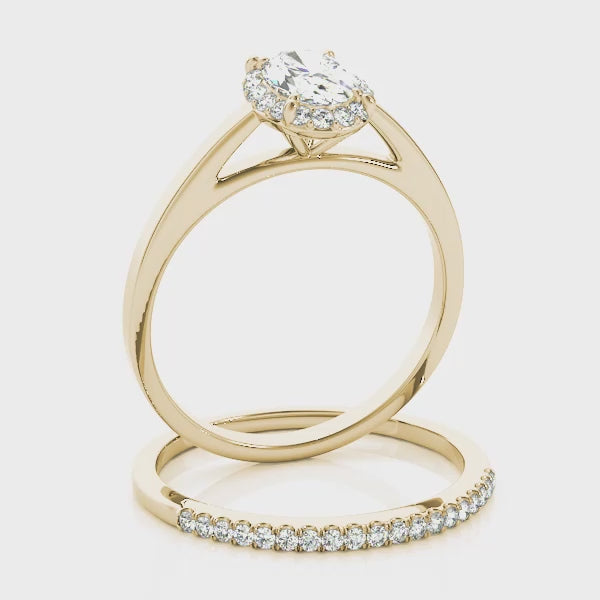 This timeless engagement ring features a 1CT oval-shaped Lab Grown Diamond (VS1/F/Excellent) encircled by 18 natural diamond side stones in a luminous halo. A cathedral-style 14K Yellow Gold setting lifts the center stone to enhance light reflection, while the polished band’s consistent width provides a sleek, modern finish. Also available in rose or two-tone yellow and white gold, this design can be purchased as a Setting Only or with your preferred center stone. Pair it with a matching wedding band for a complete and elegant bridal set.